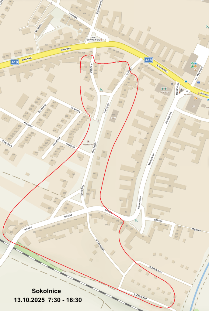 informujeme Vás, že z důvodu plánovaných prací na zařízení distribuční soustavy - rekonstrukcí, oprav, údržbových a revizních prací - bude přerušena dodávka elektrické energie dne 13. 10. 2025, od 07.30 do 16.30 hodin v části obce Sokolnice. Viz příloha.