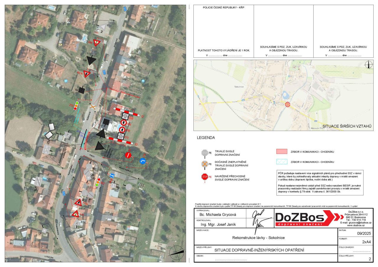 na základě provedené prohlídky mostního objektu pro pěší na ul. Kaštanová v Sokolnicích bylo zjištěno, že tento most vykazuje značně špatný technický stav (narušené železné vzpěry). Vedení obce Sokolnice tedy rozhodlo o jeho rekonstrukci, která bude spočívat v demontáži stávající pochozí části mostu, která bude nahrazena novým kompozitním materiálem, ošetřením konstrukcí nátěry a renovací zábradlí. Most pro pěší bude po celou dobu prací plně uzavřen. S ohledem na tuto skutečnost je nezbytné, z důvodu zajištění bezpečnosti silničního provozu, realizovat přechodnou úpravu provozu v uvedeném úseku pozemní komunikace. Pro průchod chodců bude na silnici č. II/418 v místě rekonstrukce realizován koridor vymezený dočasnými betonovými svodidly. Provoz vozidel bude sveden do jednoho jízdního pruhu a řízen semaforem.