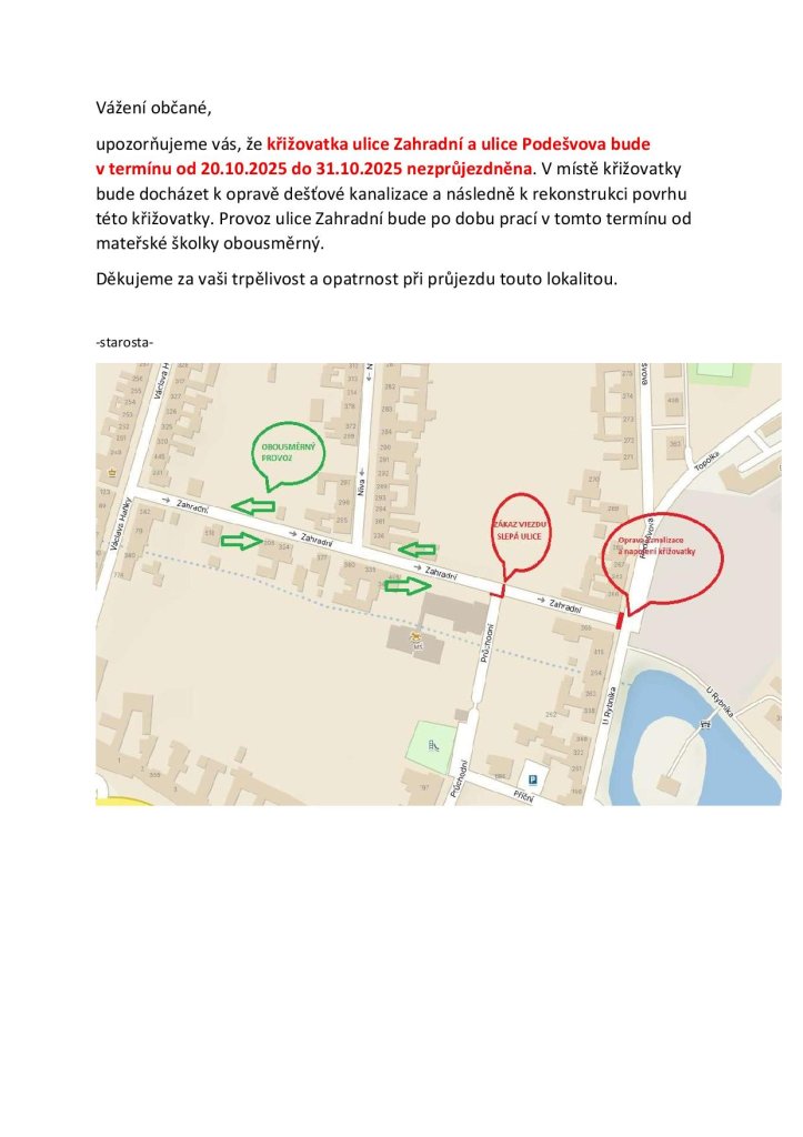 upozorňujeme vás, že křižovatka ulice Zahradní a ulice Podešvova bude v termínu od 20.10.2025 do 31.10.2025 nezprůjezdněna. V místě křižovatky bude docházet k opravě dešťové kanalizace a následně k rekonstrukci povrhu této křižovatky. Provoz ulice Zahradní bude po dobu prací v tomto termínu od mateřské školky obousměrný.