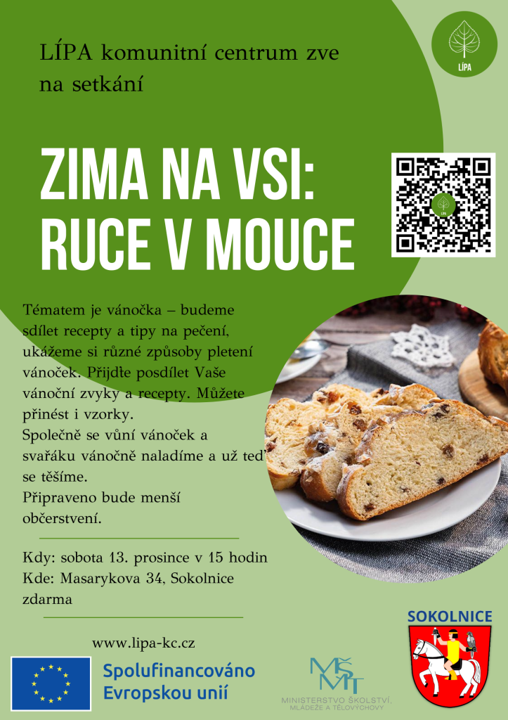 LÍPA komunitní centrum zve srdečně všechny občany na předvánoční setkání Zima na vsi: Ruce v mouce. U svařáku a vánočky si vyměníme recepty a tipy na pletení a pečení vánočky a společně posdílíme naše oblíbené vánoční tradice. Setkání proběhne v sobotu v 13. 12. 2025 v komunitním centru a je zdarma.