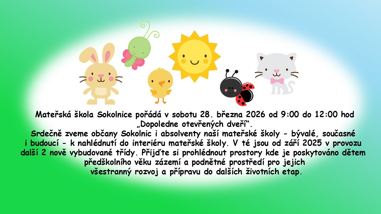 Mateřská škola Sokolnice pořádá v sobotu 28. března 2026 od 9:00 do 12:00 hodin „Dopoledne otevřených dveří".